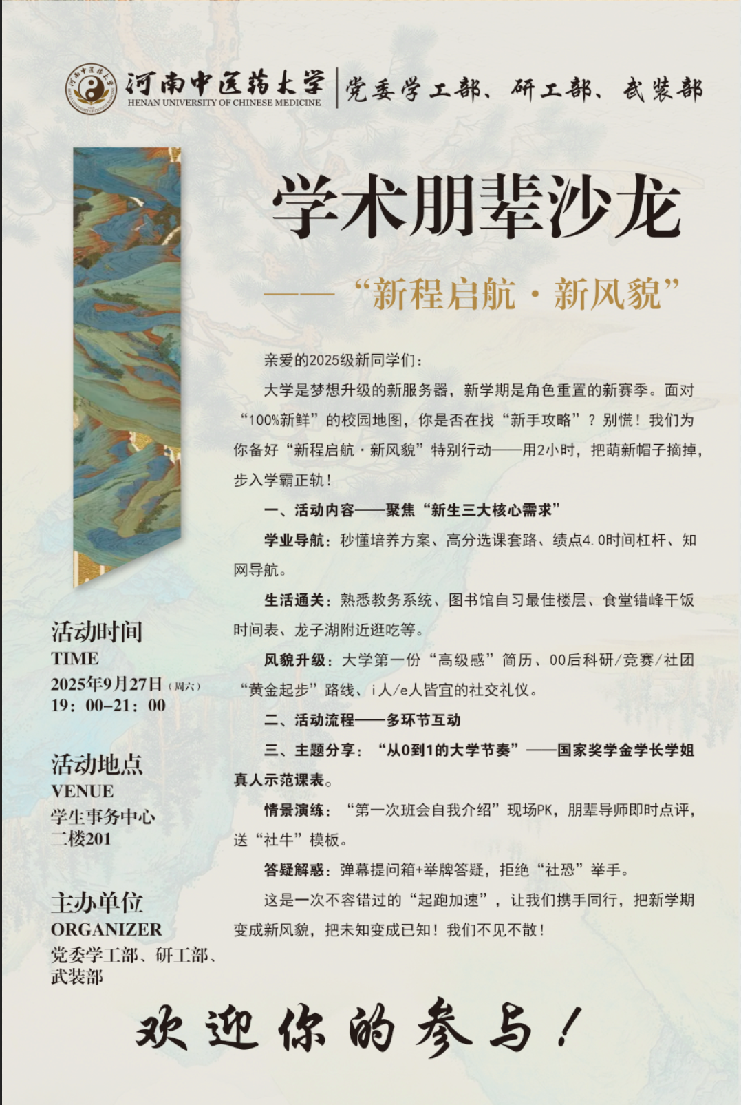 (文/图 付依萍)为助力2025级新生快速融入校园环境、提升信息素养与综合能力,9月27日,我校学术朋辈导师团队于“一站式”学生事务中心201社区议事厅举办“新程启航·新风貌”学术朋辈沙龙活动。本次活动由中医药科学院硕士研究生付依萍主持。