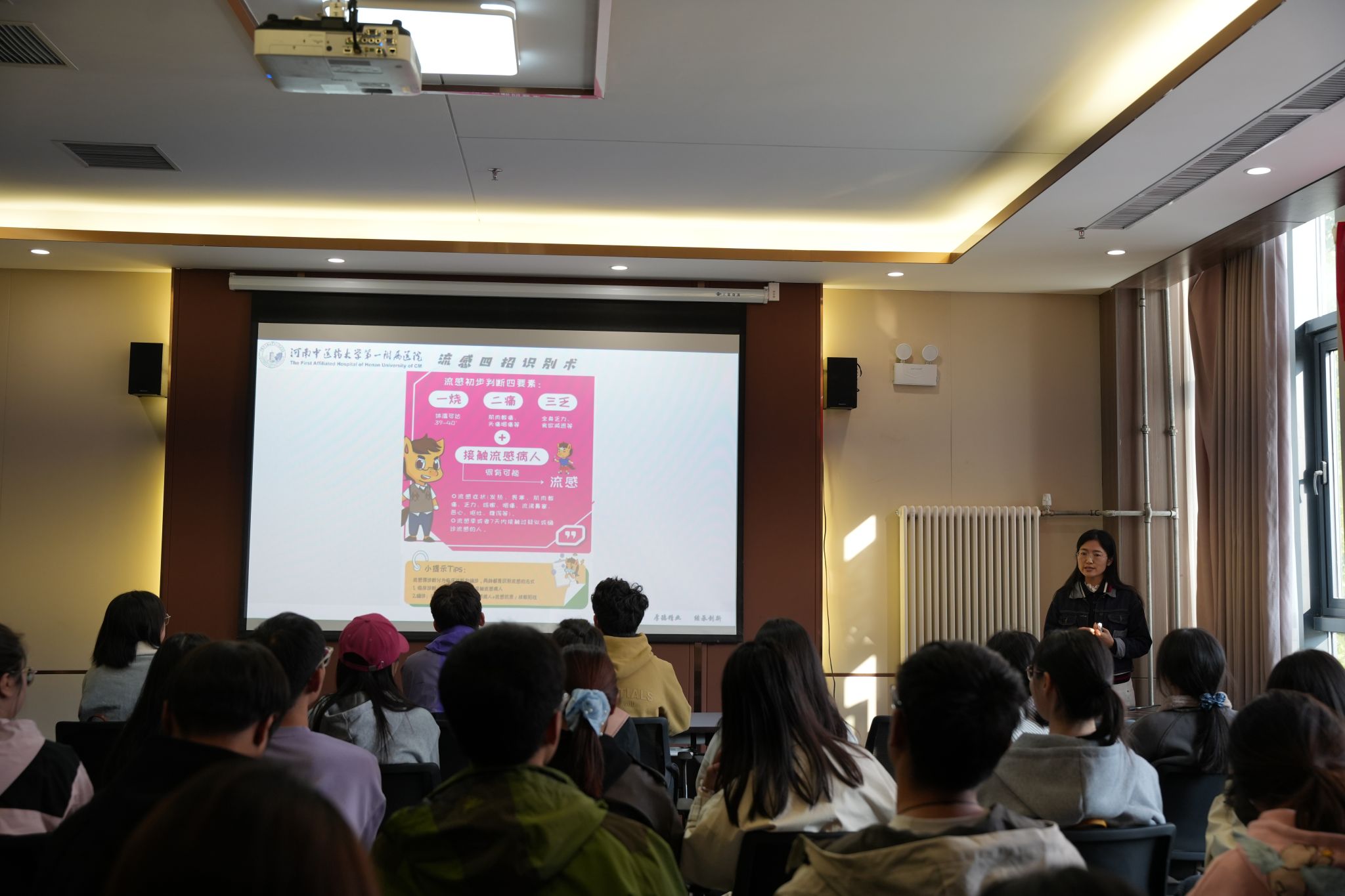 本网讯(文/图 吴一诺)为增强学生对秋季高发传染病的防控意识,切实筑牢校园健康防线,2025年10月21日,我校一附院龙子湖院区公共卫生服务中心走进学生社区,在“一站式”学生事务中心202会议室,开展“平安社区”大讲堂第一期“秋季常见传染病科普知识讲座”。一附院呼吸与危重症医学科副主任崔青荣受邀作专题讲座,各社区的楼长、层长及宿舍长代表参加本次活动。