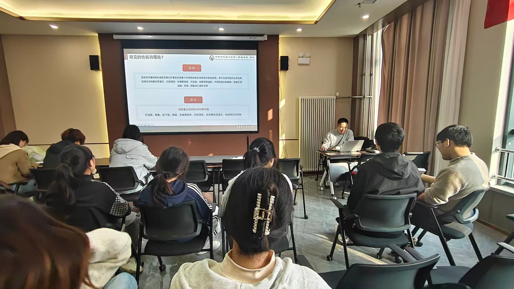 陈如兵围绕当代大学生男性健康问题展开科普,针对性病、艾滋病、慢性前列腺炎等常见男科问题,讲解疾病成因、症状及防治方法,内容专业且贴近生活,增强了对男性健康问题的认知。荆兆鹏则聚焦“小石头,大麻烦——揭秘泌尿系结石”主题,详解各类泌尿系结石的形成、危害及治疗手段,同时科普泌尿系肿瘤相关知识,为养成健康生活方式提供了实用指导。
