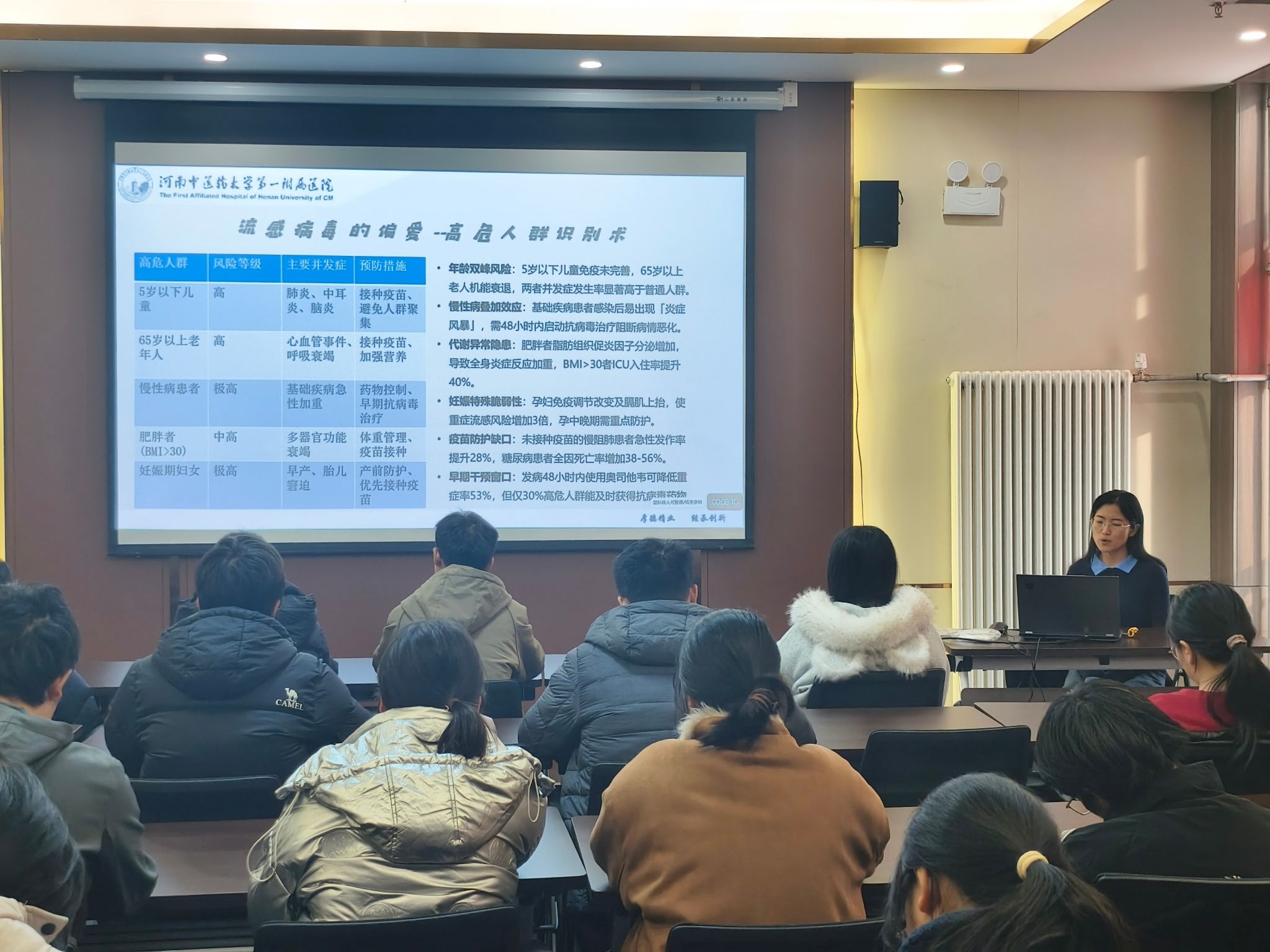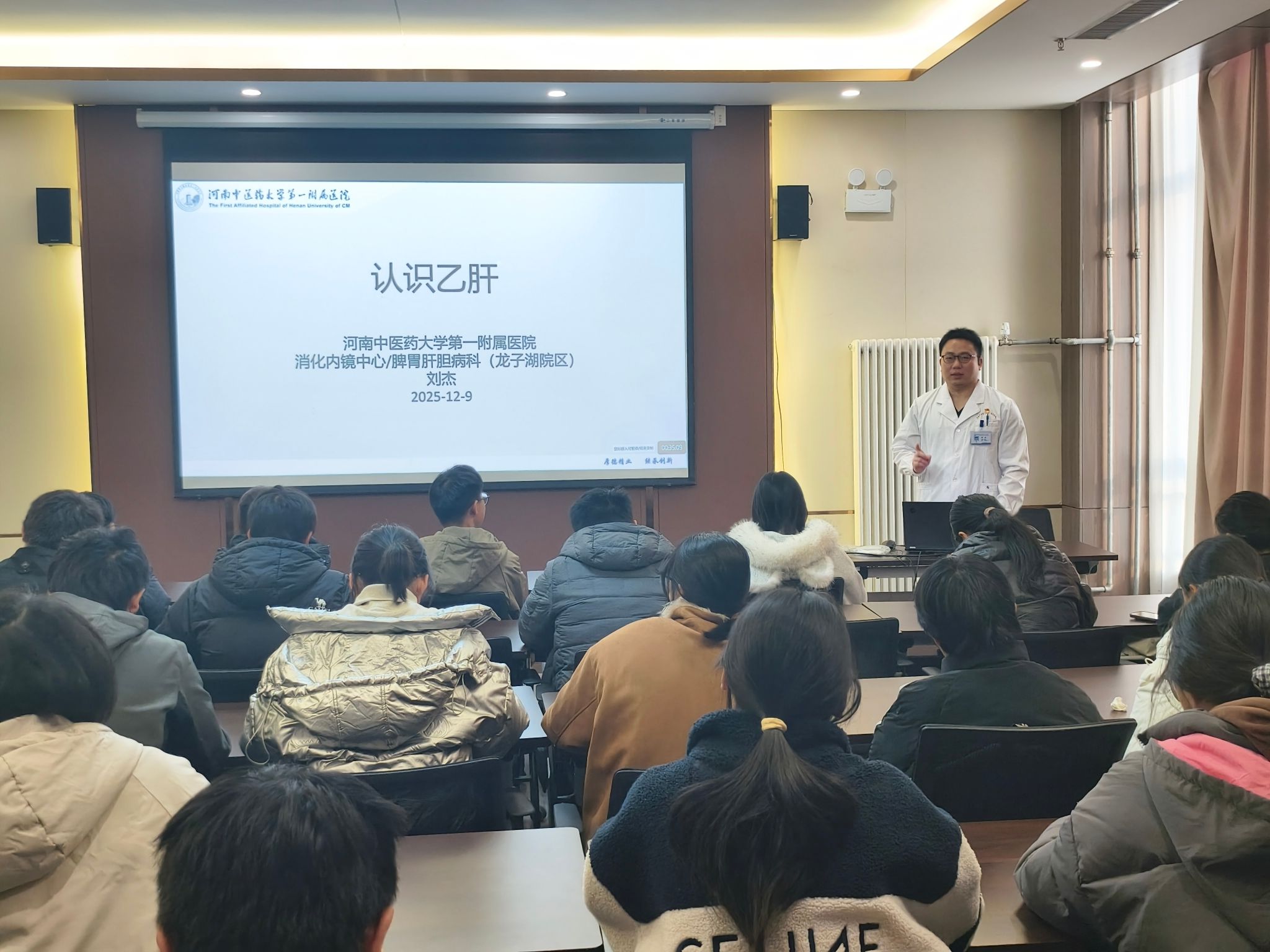 讲座中,崔青荣以《流行性感冒的防治》为题,系统讲解了流感的传播途径、典型症状及中医药特色防治方法。他结合校园实际防控案例,深入阐释了“早预防、早识别、早干预”的防控原则,并就科学佩戴口罩、规范环境消毒等提供了具体实用的防护指导。刘杰则围绕《“肝”货满满的乙肝防治知识》主题,详细介绍了乙肝的传播方式、潜在危害与日常防护要点,强调了肝病早期筛查的重要性,并为引导学生养成健康生活方式提供了专业建议。